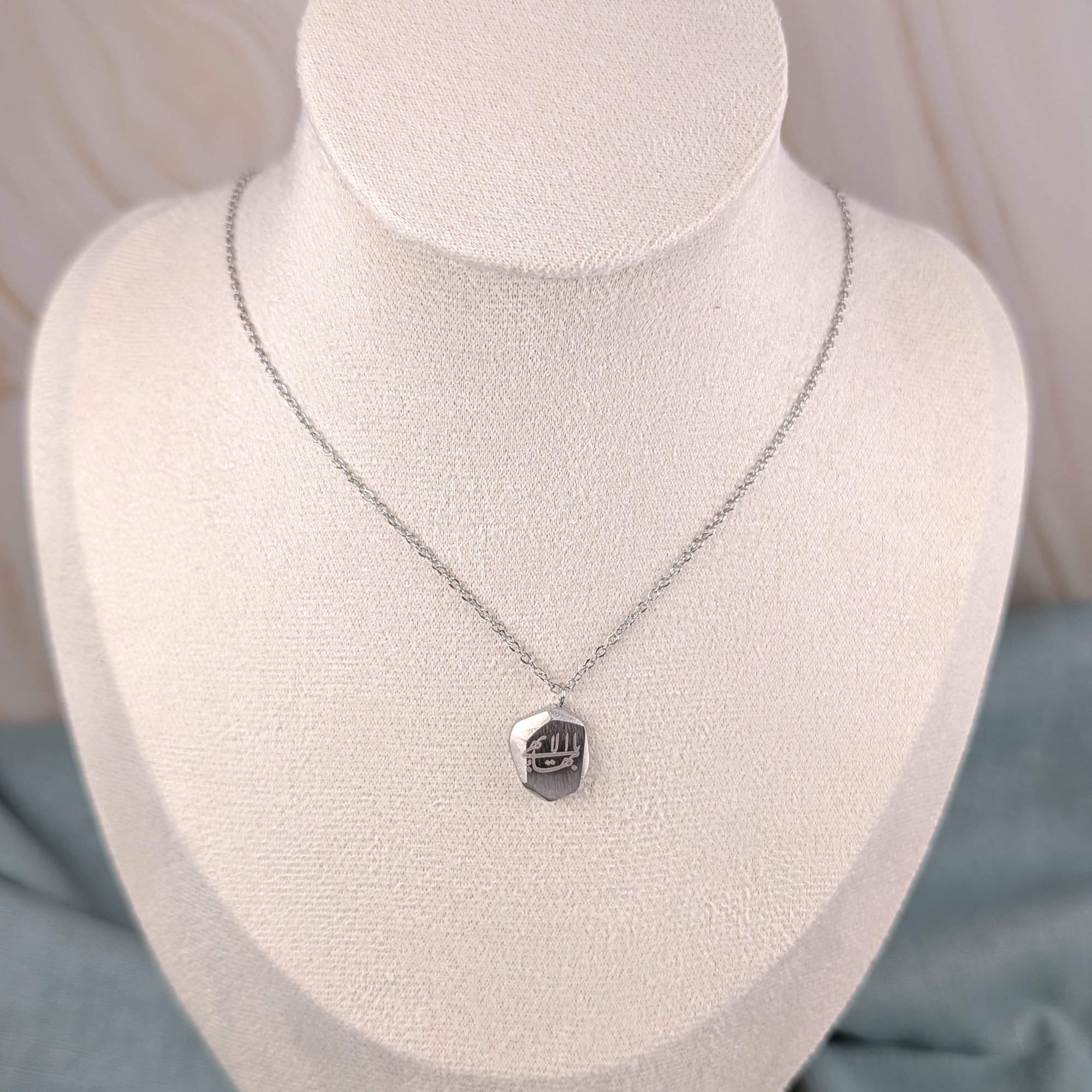 This necklace is delicate and modern, made of Stainless Steel with 18k gold plating; it has the Greatest Name engraved on one side and the ringstone symbol on the other. One side has a shiny finish and the other matte and it comes with a fine chain. It is perfect for layering or wearing on its own.