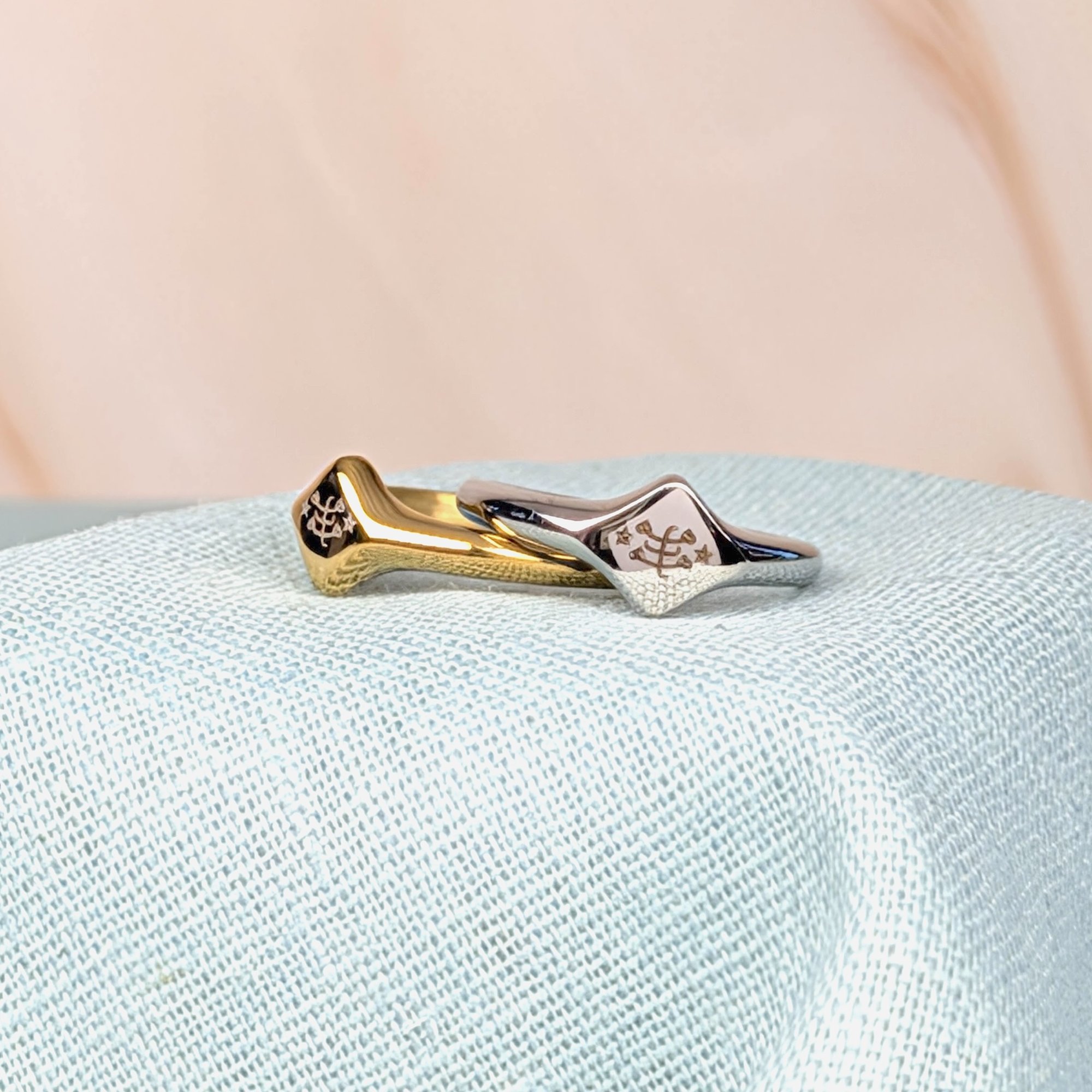 Beautifully crafted, a classic ring with a modern twist. Elegant and minimalistic, this ring is made of stainless steel, with the Ringstone Symbol engraved on it with laser. Available in silver color and yellow gold plating.